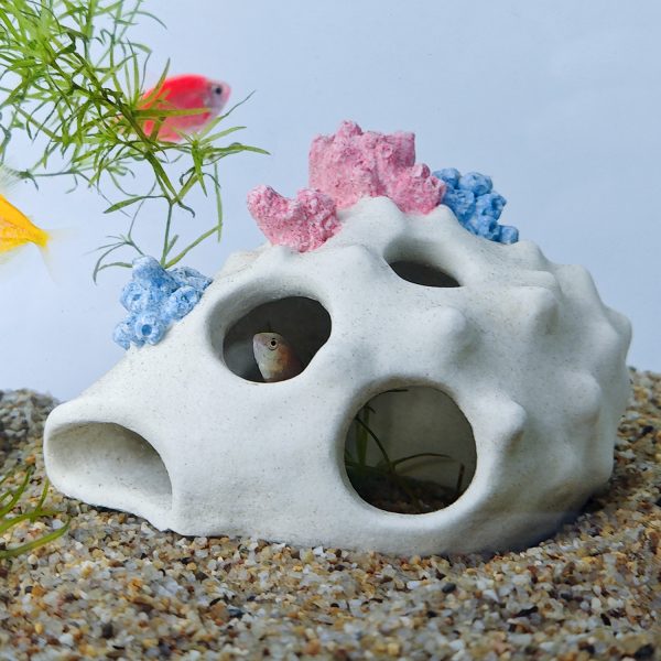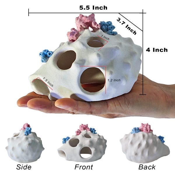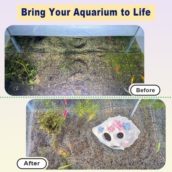 - Perfect Size: Measures 5.5″ (L) x 3.7″ (W) x 4″ (H), ideal for small aquariums and medium-sized fish tanks (5-50 gallons). The conch-shaped design, featuring four holes, provides a safe passage and shelter for small fish. It can be paired with other decorations to create dynamic environments.